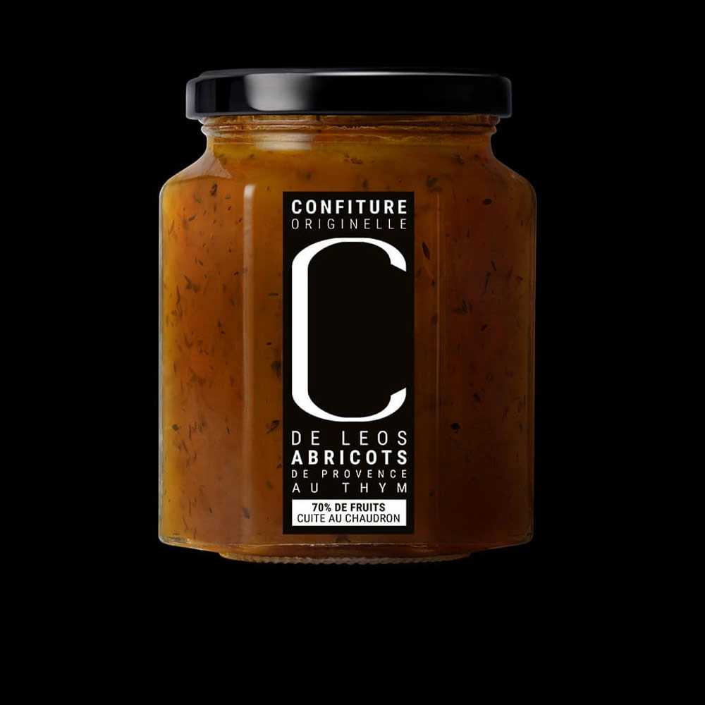 Une confiture extra (70% de fruits), artisanale, cuite au chaudron, fabriquée à partir du mariage d’une sélection d’abricots de Provence et du thym sauvage du domaine de LEOS