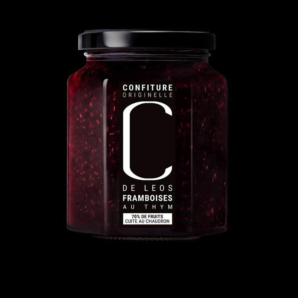 Confiture fabriquée à partir d’une sélection de framboises de grandes qualités gustatives et du thym sauvage récolté en floraison et à la main sur le plateau du Domaine de Leos qui n’utilise ni engrais chimiques, ni pesticides et qui est certifié « Haute Valeur Environnementale 3A ».