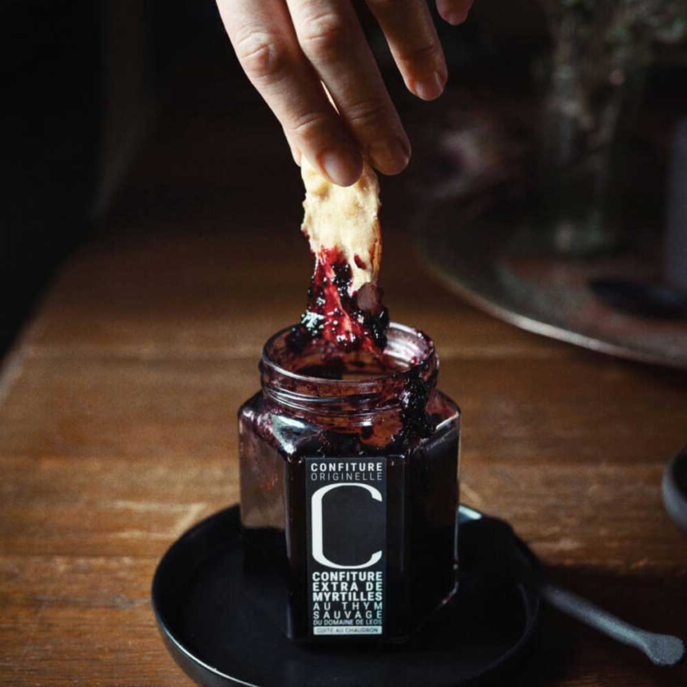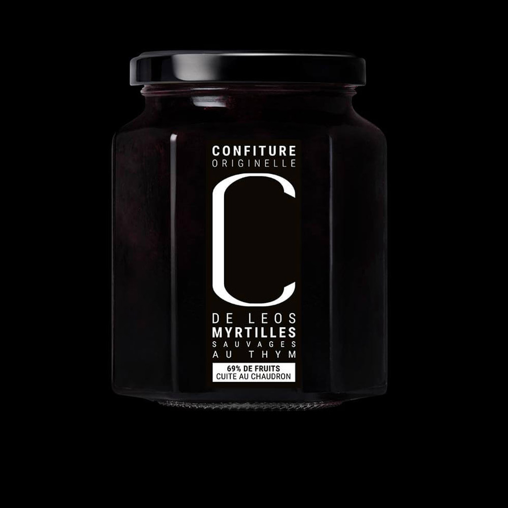 Une confiture artisanale, cuite au chaudron, fabriquée à partir d’une sélection de myrtilles et du thym sauvage du domaine de LEOS